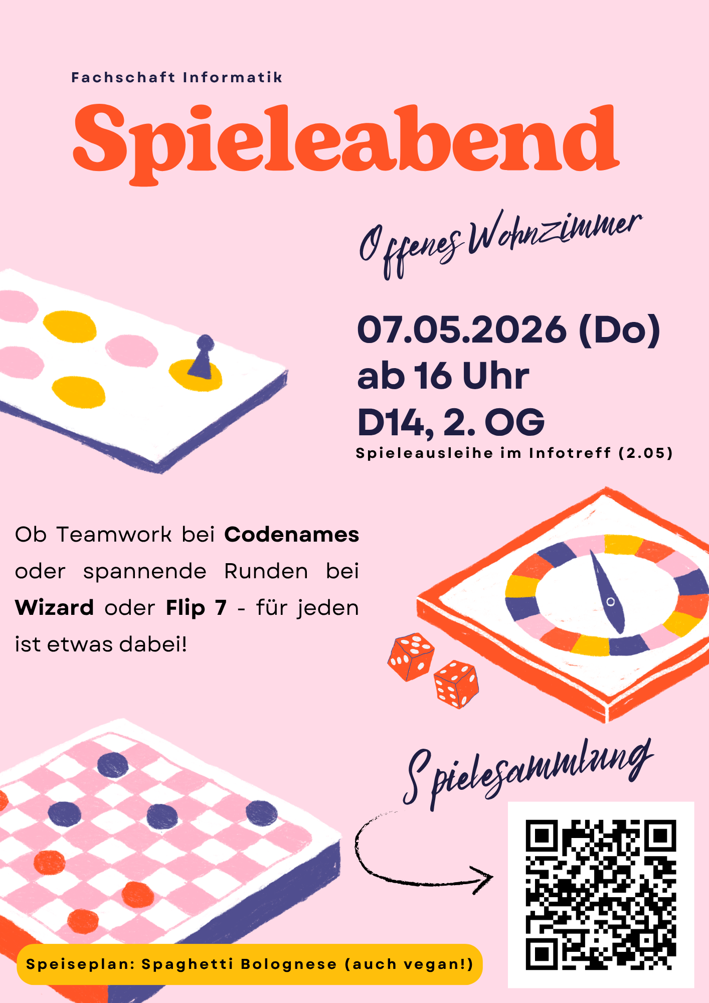 wir hoffen, euer Semester hat gut begonnen! Um gemeinsam entspannt ins neue Semester zu starten, laden wir euch herzlich zu unserem Spieleabend ein:
