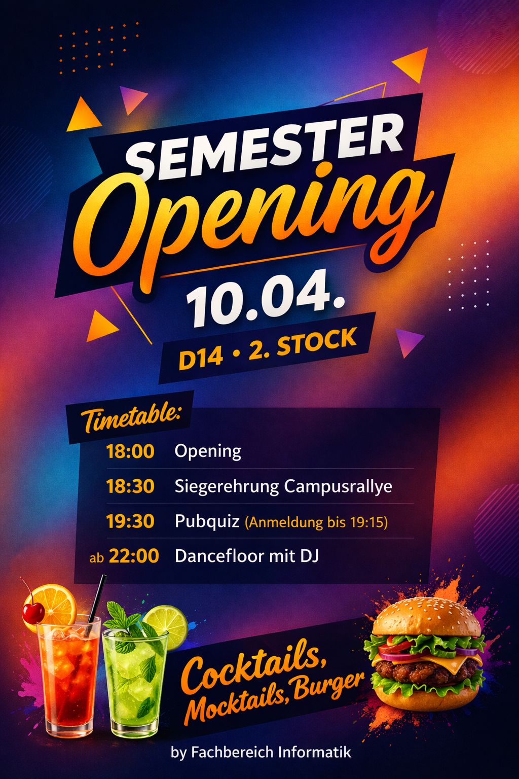 TL:DR 📅 Datum: 10.04.2026 🕔 Start: ca. 18:00 Uhr 🍔 Ab 18 Uhr: Grillen 🏆 Ab 19:30: PubQuiz 🎶 danach: Musik und Dancefloor 📍 Ort: D14/2. Stock