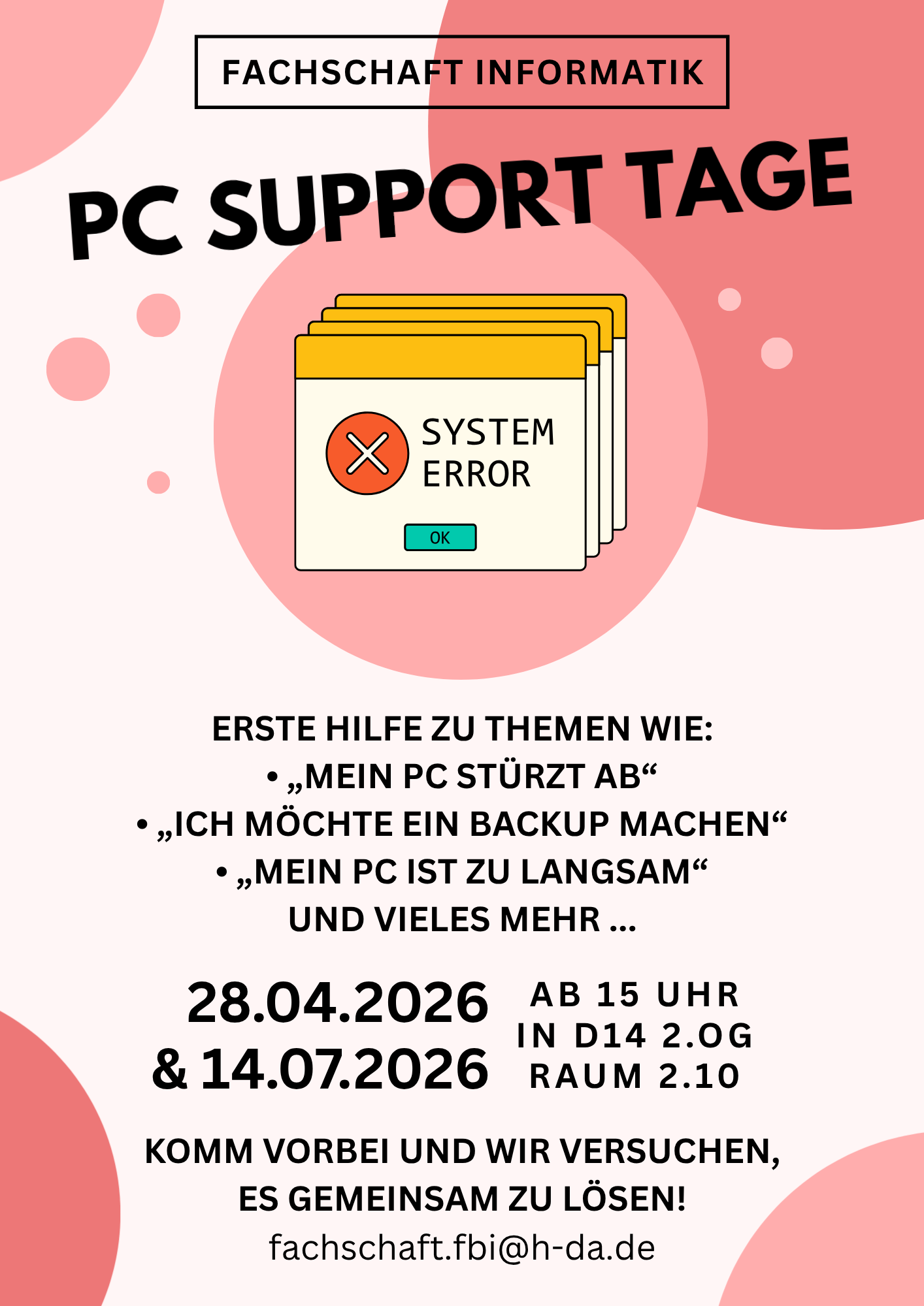 P.S.: Wenn auch Du Lust hast, Deine Hilfe anzubieten (keine besonderen Kenntnisse erforderlich), dann melde dich bei uns unter fachschaft.fbi@h-da.de oder komm einfach vorbei - wir freuen uns über jede Unterstützung!